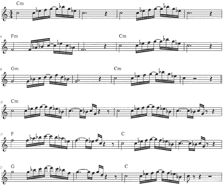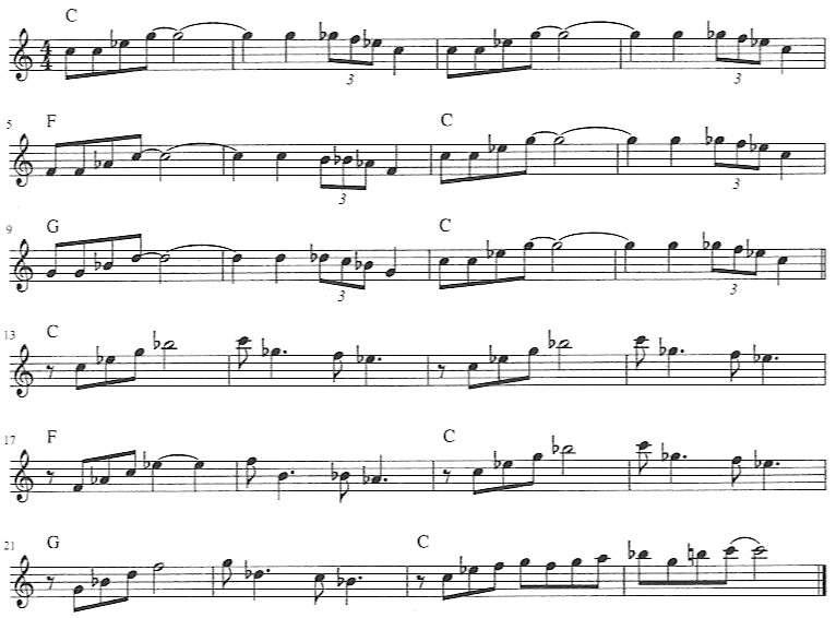 Our first playing lesson consists of two exercises played back-to-back over a 24 bar medium shuffle straight-ahead blues track. The first exercise establishes the first five notes of the blues scale, the second brings in the flat 7th and 8th (octave). Notice how the flat 5 is emphasized and not just used as a passing note of the scale. Give a listen and then go for it!