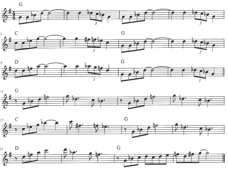 Remember, the pentatonic major scale is 1 2 3 5 6. In G as is below for altos the numbers equate to G A B D E. If you follow along you can see where I deviated from this scale and played the flat 3 and 7. Not only does it work, it sets up the upcoming 4 chord really well with that flat 7 leading into it.