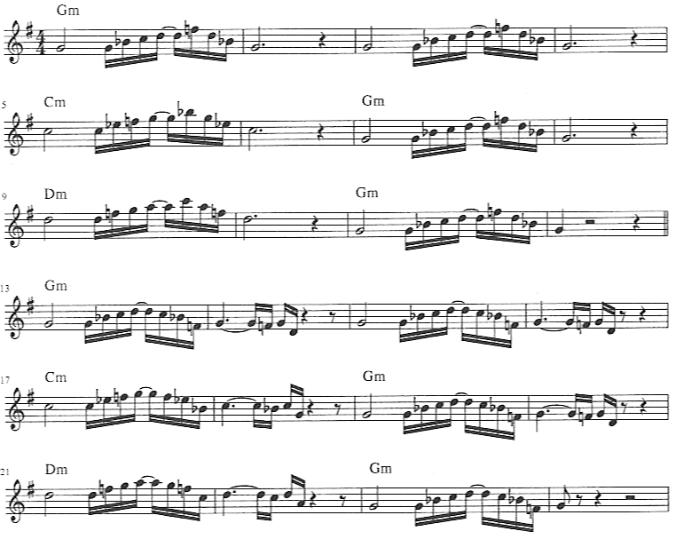 Our first playing lesson consists of two exercises played back-to-back over a 24 bar medium shuffle straight-ahead blues track. The first exercise establishes the first five notes of the blues scale, the second brings in the flat 7th and 8th (octave). Notice how the flat 5 is emphasized and not just used as a passing note of the scale. Give a listen and then go for it!